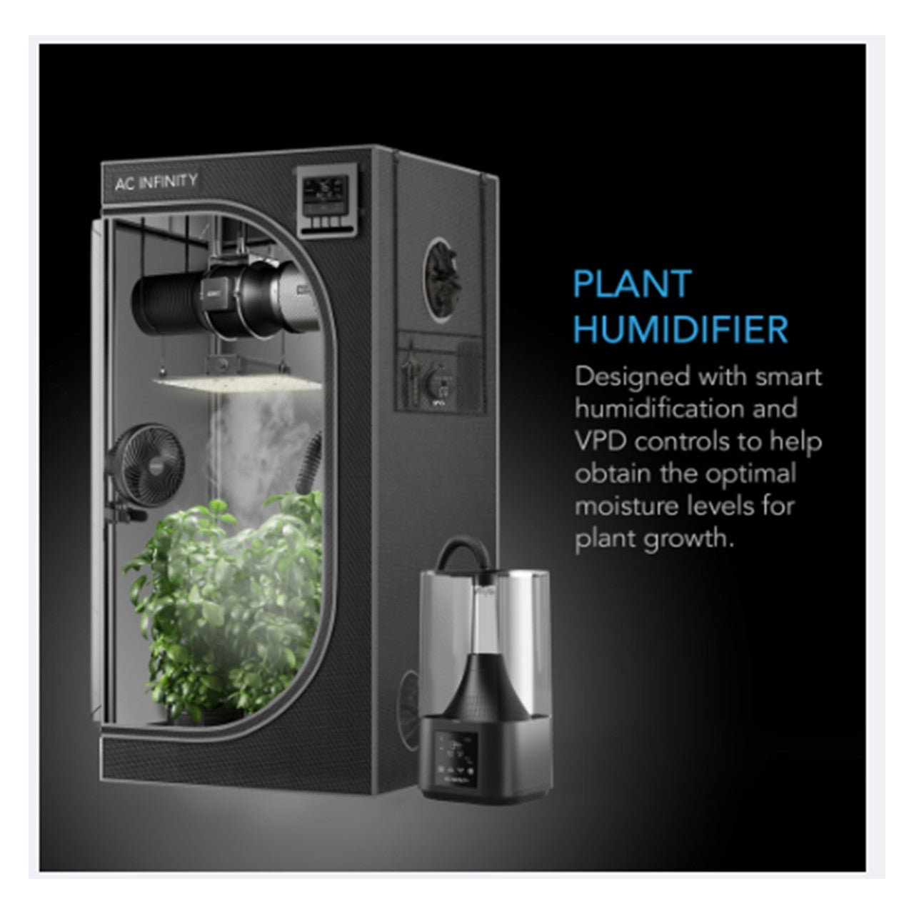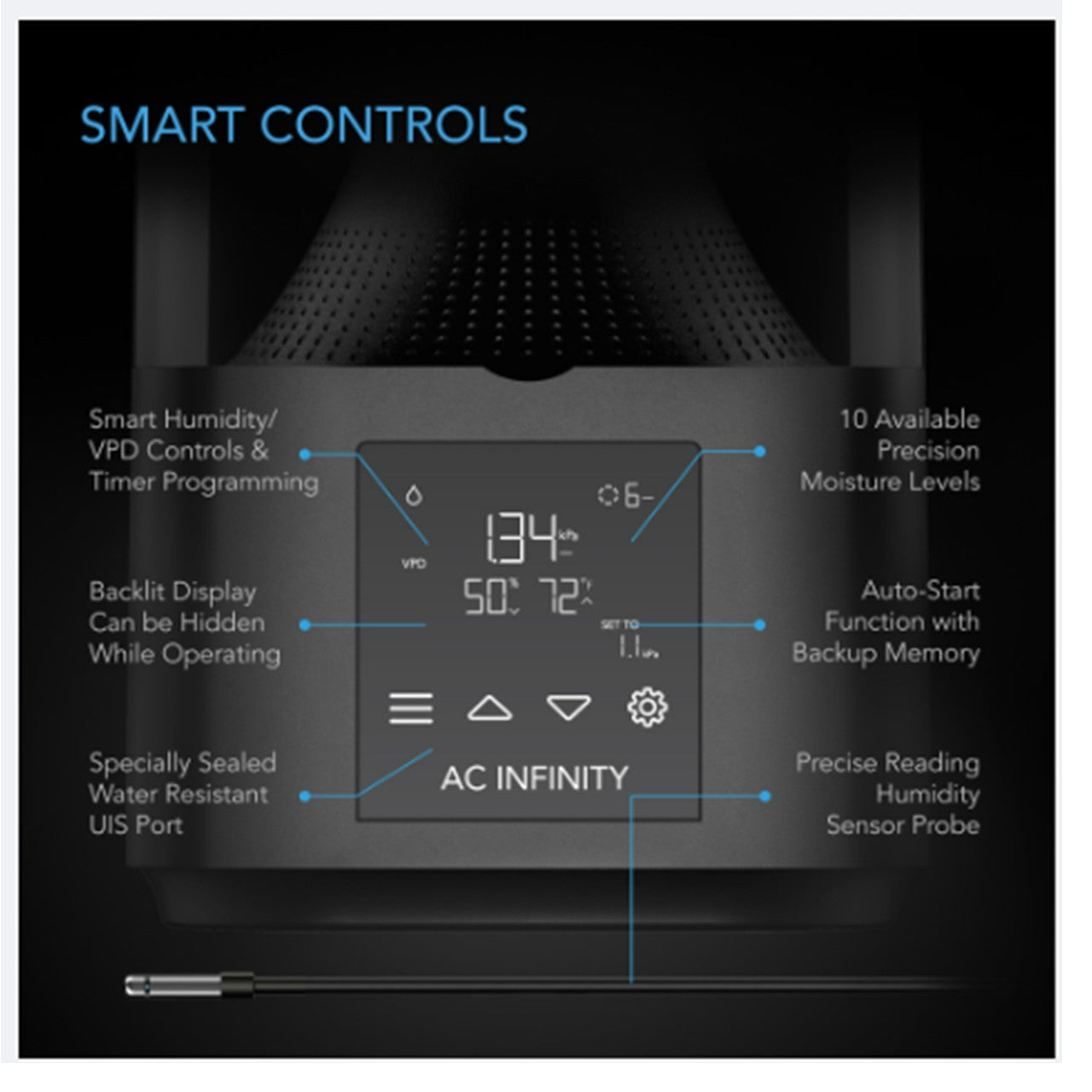 A next-gen 4.5L humidifier designed with smart controls and targeted vapor delivery to obtain ideal humidity levels for successful plant growth. Its body is specially sealed for enhanced water resistance, ensuring no water tank leakage to extend and preserve its long operational lifespan. The controller features onboard humidity and VPD triggering, which utilizes a corded sensor probe for accurate readings, and timer programming. Once activated, the innovative EC ultrasonic vaporizer digitally pulses water to distribute moisture throughout your grow space. This degree of control, together with smart programming, will allow you to fine-tune your climate to facilitate healthy nutrient uptake. This product is a part of the UIS™ platform of grow devices and smart controllers, designed to unite with the AC Infinity app over WiFi to achieve your ideal environment.