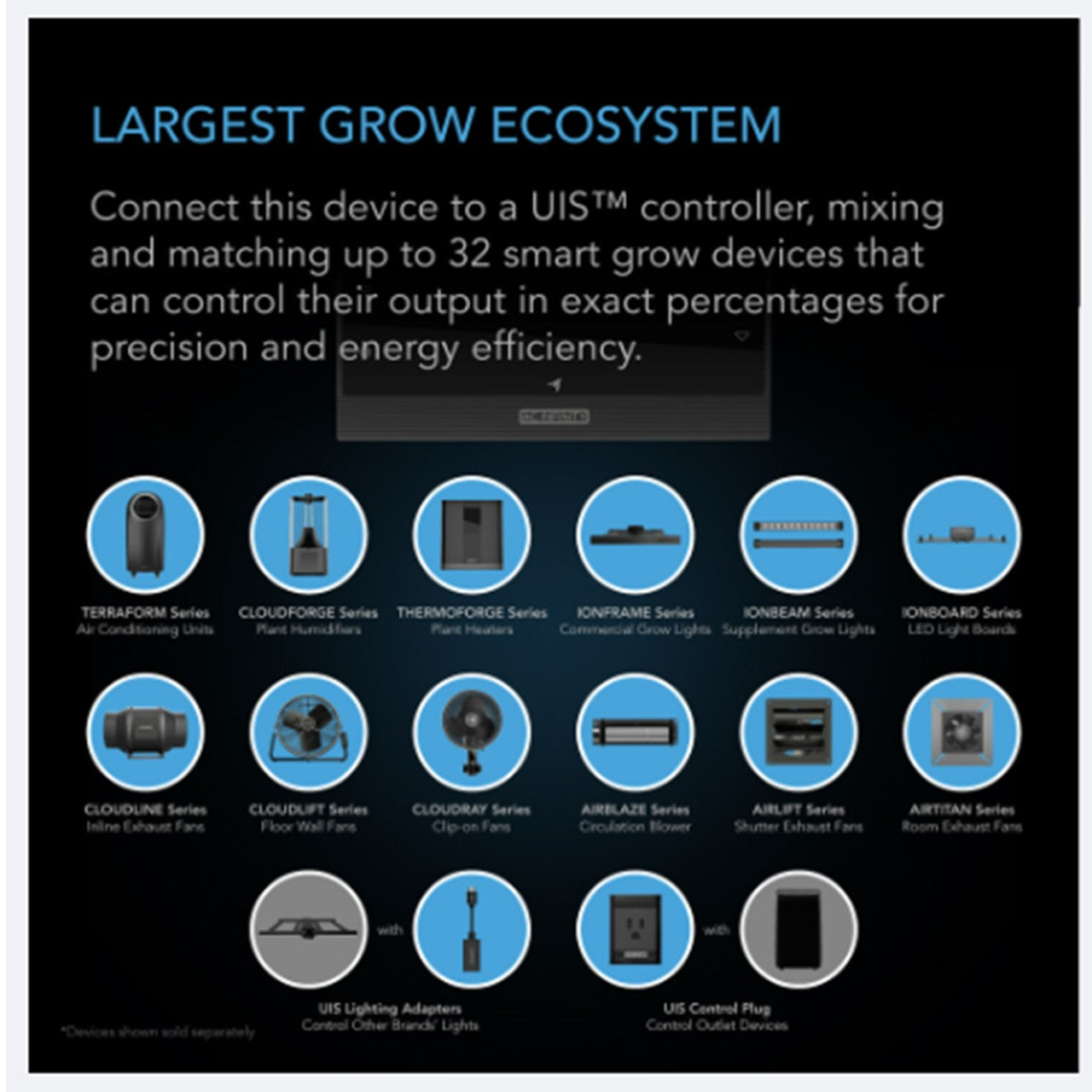 The environmental humidifier’s onboard controller is equipped with humidity and VPD triggers plus timer programming. The VPD triggers can intuitively generate humidity at the exact time needed to maintain optimal moisture levels. Digitally set up to 10 levels of condensation to generate precise levels of humidity for your plants in any stage of their growth cycle. You can connect this smart humidifier to UIS controllers to integrate with other grow devices and access more dynamic climate triggers, grow cycles, and schedules.