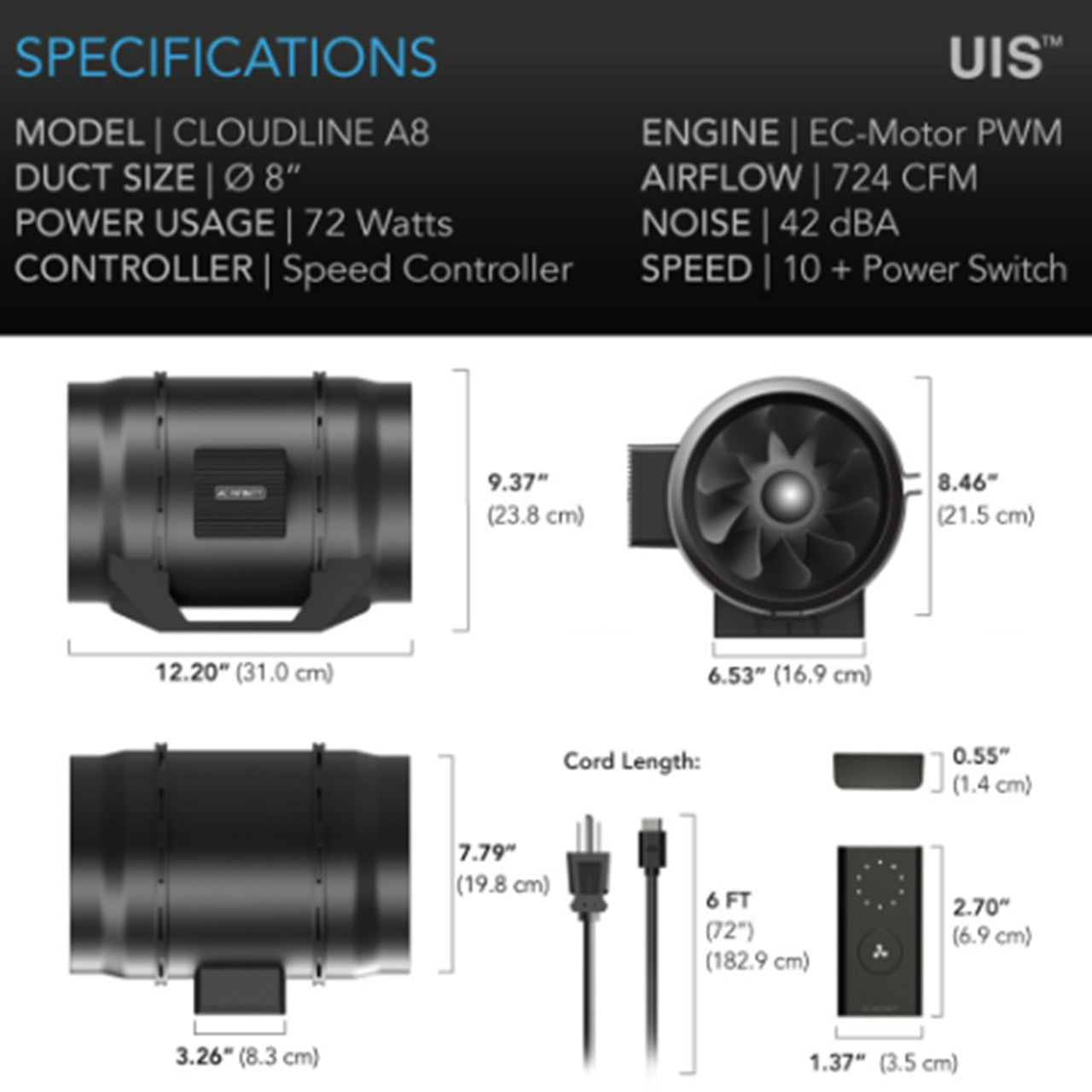 CLOUDLINE A8, Quiet Inline Fan WITH SPEED CONTROLLER, 8-INCH