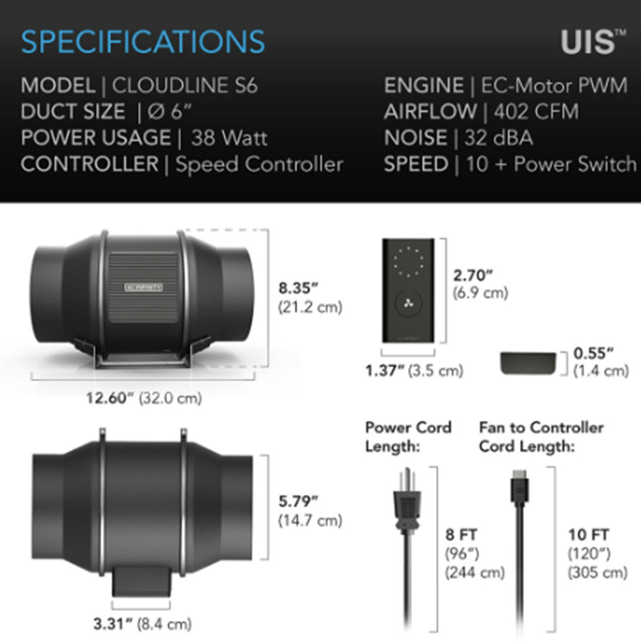 CLOUDLINE PRO S6, Quiet Inline Duct Fan System with speed controller, 6-INCH